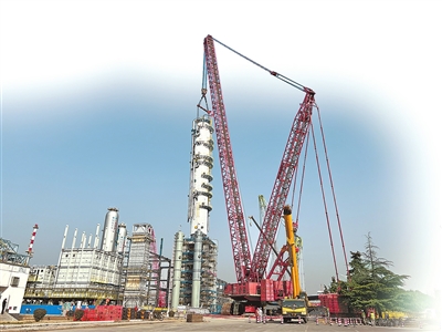 2月10日,百万吨乙烯项目炼油配套工程加氢裂化装置分馏塔吊装现场。孟鲁宁 摄