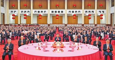 人民大会堂宴会厅灯光璀璨、喜气洋洋,各界人士2000多人欢聚一堂、共迎佳节,现场洋溢着欢乐祥和的节日气氛。