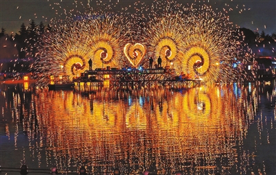 2月11日,在洛阳市隋唐城遗址植物园,2026年“神都上元灯会”试灯,非遗打铁花表演异彩纷呈。 张光辉 摄