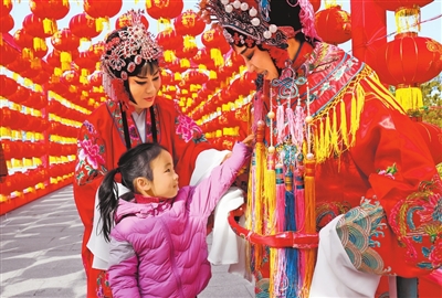 2月13日,安阳市内黄县文化体育中心,演员和小观众亲切互动。新春将至,内黄县文体中心张灯结彩,大红灯笼高高挂起,处处洋溢着喜庆祥和的节日氛围。 刘肖坤 摄