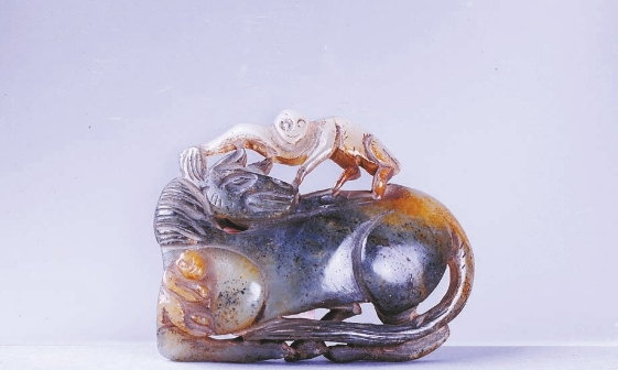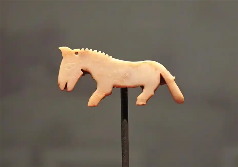 这匹玉马出土于安阳殷墟妇好墓,是国内目前所知最早的马形象。玉马高5厘米,宽7.7厘米,形制小巧,玉质温润,马鬃呈锯齿状,耳后钻有小圆孔,虽造型古朴,却巧妙呈现出马的灵动姿态。