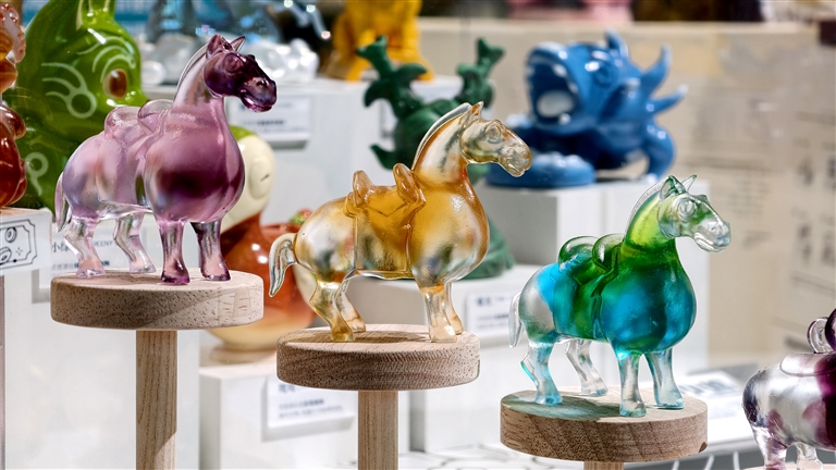 洛阳唐三彩多以黄、绿、白为主要釉色,且盛行于唐代,故名“唐三彩”。唐三彩烧制技艺现为国家级非遗代表性项目。唐三彩中,马的题材比较多,其塑造手法也十分出色,有的扬蹄飞奔,有的徘徊伫立,有的引颈嘶鸣,形态生动逼真。随着时代的发展,代表性传承人在继承传统的基础上,创新设计了一系列新的三彩马,如憨态可掬的墩墩马,已经成为洛阳旅游的主打伴手礼。今年春节,高家三彩、张家彩窑与国民消费品牌跨界联合推出的“马上雪王”与“马上旺”两大文创在网上走红。