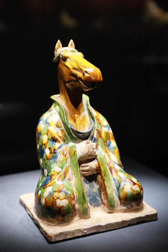 三彩黑釉陶马是中国国家博物馆的“明星文物”,1972年出土于河南洛阳,为国内仅有的两件唐代黑釉陶马之一。马俑除面、鬃、尾、蹄涂白釉外,全身披黑釉,有“四蹄踏雪”之美感。其造型呈现盛唐御马典型特征:颈长头小、膘肥臀圆、体魄健壮,四蹄呈行进姿态,马尾绾结上翘,参考了中亚地区的突厥马种。马鞍鞯饰以绿、黄、白三色釉,革带配有15枚浮雕纹饰圆形配件。这件陶马造型雄健,釉色调匀,姿态自然,是唐三彩马中不可多得的精品。