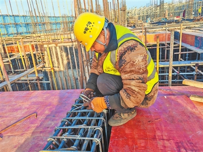 49岁的钢筋工夏海军蹲在楼板边缘,手里的铁钳用力一紧,把最后一道箍筋拧实了,直起腰,捶了捶后背。“今年年底,这栋楼就要投入使用了,得加紧干。”夏海军是安徽合肥肥东县人,头一回在外地过年。