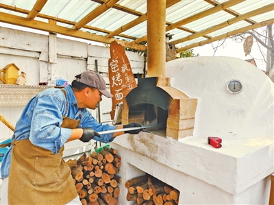 “面包好了!”随着杨立的一声吆喝,在后院池塘边散步游玩的顾客闻声围拢到窑炉前,挑选心仪的面包。有人顾不上坐下,就站在炉边大快朵颐。“新鲜出炉的窑烤面包才对味!”一位年轻顾客的点评,引来一圈食客会心的笑声。果木面包的清香伴着笑声,在这座农家小院里飘荡。
