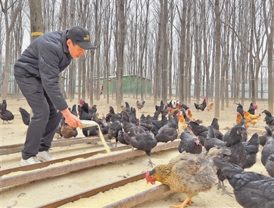 “我用的饲料是用玉米、豆粕、麸子皮按照严格比例配制的,马虎不得。”2月14日,在郑州市二七区樱桃沟街道三李村,65岁的村民韦喜来正在自家3亩多的养鸡场里喂鸡。他扬起铲子,将饲料均匀撒出去,一群群乌骨黑鸡、柴鸡便欢快地簇拥在他脚边。他的手机不时响起,大多是找他买鸡蛋的,“俺家的产品订单,都排到年后了”。