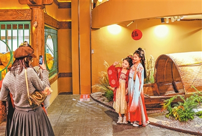 2月19日,市民在郑东新区“星河里·郑河新序”游玩。该街区以“赶大集,过大年”为主题,将传统年俗与沉浸式体验巧妙融合,汇聚汉服体验、非遗展演、市井美食、沉浸式演艺等业态,让市民在古色古香的市井场景中感受浓郁的新春氛围。 本报全媒体记者 邓放 摄