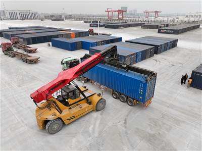 在新郑市中欧班列集结中心东作业区,准备发往老挝万象的集装箱正在装车。 栗璋鹏 摄