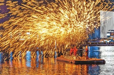 2月21日,郑州金融岛年味十足,水上打铁花精彩上演。吴泽堃 摄