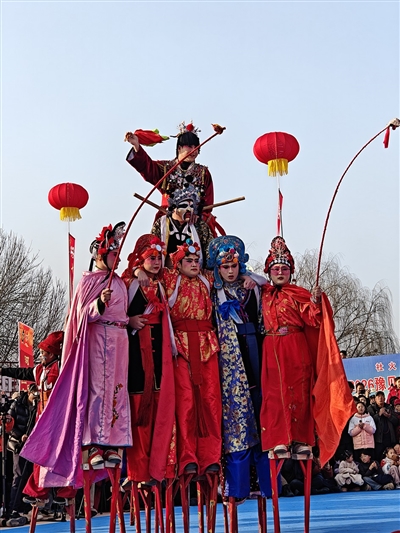 2月1日,第十八届中原(鹤壁)民俗文化节系列活动之浚县“社火村超”高跷晋级赛在古城西门举行。 高文然 摄