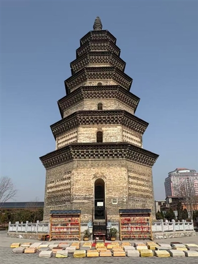 如今,矗立于邓州古城遗址核心位置的福胜寺塔依旧醒目。这座七级仿楼阁形制的青砖石塔,古朴之中透着厚重,塔身遍布近2000个佛像砖雕。在塔下,不时有市民前来转塔祈福,对美好生活的向往在一代代人心中流传相继。