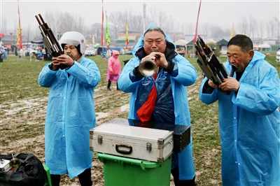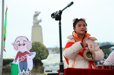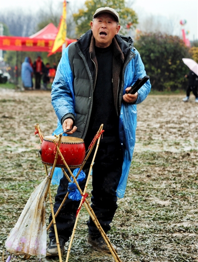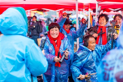 艺人冒雨表演,热情不减。本报全媒体记者 王铮 摄