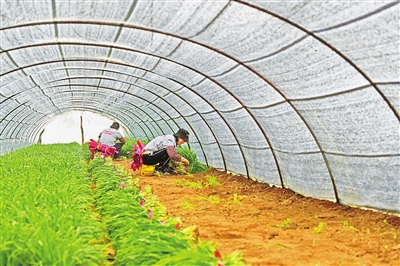 3月2日,位于黄河岸边的孟州市现代农业产业园万亩韭菜种植基地,种植户正在大棚里收割头茬韭菜。 白水平 摄