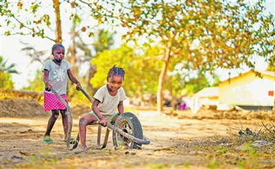 2026年1月18日,几内亚博凯地区,小朋友在当地新建的房子前玩耍,中国企业的到来改善了当地人们的生活。 本报全媒体记者 王亚鸽 崔超 摄