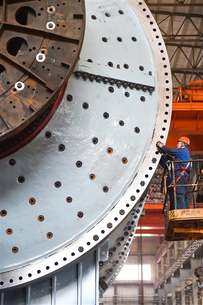 在位于洛阳市涧西区的中信重工生产车间内,工人正在装配出口海外的超大型矿用磨机产品。 黄政伟 摄