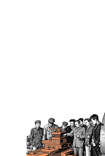 洛阳矿山机器厂建厂初期,焦裕禄同志(左四)与苏联专家(左五)检查机床设备。 本报资料图片(效果由AI生成)