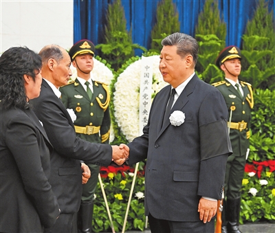 3月10日,宋平同志遗体在北京八宝山革命公墓火化。习近平、李强、赵乐际、王沪宁、蔡奇、丁薛祥、李希、韩正等前往八宝山送别,胡锦涛送花圈表示哀悼。这是习近平与宋平亲属握手,表示深切慰问。 新华社记者 谢环驰 摄