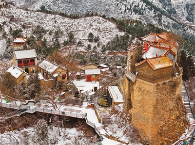 两场春雪过后,林州市柏尖山景区呈现出一派素雅景致。(3月9日摄)。