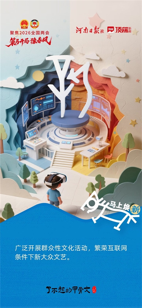当三千年前的甲骨文与2026年政府工作报告相遇,古老和新潮有了交集。以甲骨文对应政府工作报告中的文旅体育内容,邀请读者策马驰骋于创意纸雕场景之中,感受河南深厚文化底蕴。