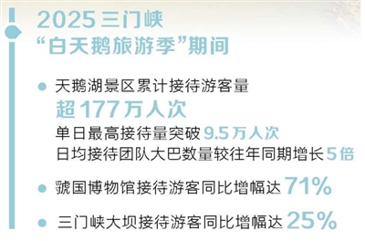 一组数据见证热度:天鹅湖景区累计接待游客量超177万人次,单日最高接待量突破9.5万人次,日均接待团队大巴数量较往年同期增长5倍;虢国博物馆旅游季期间接待游客同比增幅达71%;三门峡大坝接待游客同比增幅达25%。“到三门峡看天鹅”,已成为游客的冬日选择。