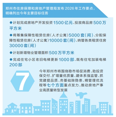 3月13日,郑州市住房保障和房地产管理局发布2026年工作要点,明确列出今年主要目标任务——计划完成房地产开发投资1500亿元、投放商品房500万平方米,将筹集保障性租赁住房(人才公寓)5000套(间)、分配保障性租赁住房(人才公寓)10000套(间)、纳管各类租赁住房30000套(间),计划新增物业管理面积500万平方米,完成住宅小区老旧电梯更新1000部、既有住宅加装电梯200部。