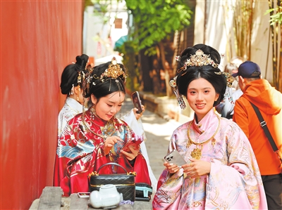 身着古装的游客在福州上下杭传统街区游玩。新华社记者 姜克红 摄