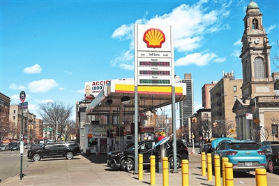 这是3月14日在美国纽约曼哈顿拍摄的一家加油站的油价标牌。由于美国和以色列袭击伊朗导致地缘紧张局势持续,国际原油价格不断飙升。新华社/法新