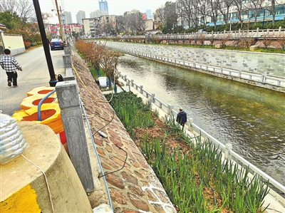 但在金水河南岸的一处人行道狭窄的护坡上,记者看到,有20多米的路段,原本种植的绿植已被人替换成了大葱、青菜等时令蔬菜。一尺多高的大葱长势旺盛,跟周边绿化带里的低矮绿植形成鲜明对比。在道路栏杆边,还摆放着由3个塑料隔离桶桩改造成的浇菜地的“水桶”,旁边接着电源线和插座,几条塑料水管和农具散落在这块“菜地”周围。