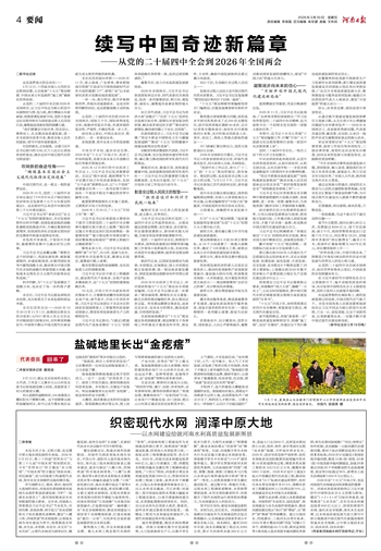 坚守民生导向,彰显水网建设新担当。水利为民,民生优先。河南始终把保障民生福祉作为水网建设的出发点和落脚点,让水网建设成果更多更公平惠及全体人民。南水润民。截至2025年年底,南水北调配套工程总长2094公里,累计为河南供水超266亿立方米,受益人口达3800万,是原受水规划的2.15倍,郑州、焦作、新乡等城市实现“双水源”保障,守护城乡供水安全。2025年,面对旱涝急转严峻形势,依托水网体系成功防御黄河流域编号洪水和16次较强降雨过程,调度各类水源工程供水102.73亿立方米,灌溉补源5861万亩次。2026年计划开工建设6处大中型灌区现代化改造工程;推动农村供水“3+1”标准化建设和管护,农村自来水普及率提升至97.5%,规模化供水工程覆盖农村人口比例达到70%,以水网建设夯实乡村振兴水利根基。