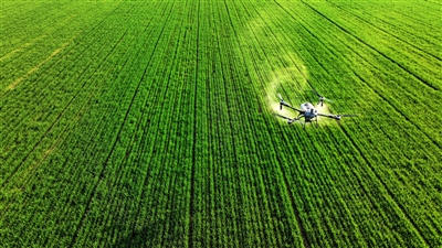 3月20日,洛阳市孟津区白鹤镇,新型无人机正对600亩高标准农田进行农药和除草剂喷洒作业,确保小麦增产丰收。 郑占波 刘芳芳 摄
