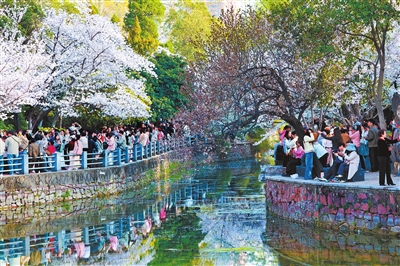 3月22日,郑州人民公园的樱花进入最佳观赏期。游客流连其间,在花海中拍照打卡,定格美好瞬间。 本报全媒体记者 聂冬晗 摄