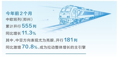 本报讯(全媒体记者 王歌 通讯员 李豫言)中欧班列(郑州)再传喜讯。3月24日,记者从郑州海关获悉,今年前2个月,中欧班列(郑州)累计开行555列,同比增长11.3%;其中,中亚方向表现尤为亮眼,开行181列,同比激增70.8%,成为拉动整体增长的主引擎。