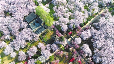 3月25日,鄢陵县唐韵樱花园樱花怒放。近日,唐韵樱花园万余棵樱花树进入盛花期,从空中俯瞰,花海如云似雪,吸引游客前来赏花。