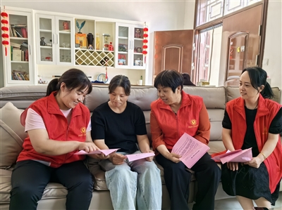 在西平县盆尧镇陈老庄村,陈春荣(右二)带领公益红娘到村民家中宣传移风易俗。受访者供图