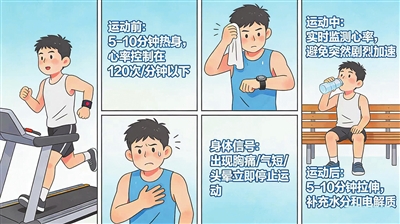 此外,运动前的健康评估,5—10分钟的充分热身,避免低温健身都很有必要。“运动中,锻炼者尤其要关注身体信号,出现胸痛、心慌、头晕、呼吸困难、四肢麻木等症状,立即停止运动,及时就医;避免突然加速、突然发力,保持运动节奏平稳。”吴卫东强调说,运动时,上至耳垂附近下至肚脐周围,这之间任何部位出现不适,都可能是心脏病的体征,必须引起重视。运动后,也要做好放松整理,缓慢降低运动强度,不要立即停下、蹲坐或洗澡,要及时补充水分,少量多次饮用,避免一次性大量饮水。