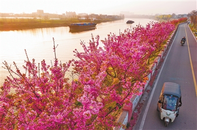 3月25日清晨,沙颍河项城段,两艘货船缓缓驶过,岸堤樱花烂漫盛放,勾勒出一幅春日水运诗意画卷。 张珑瀚 摄