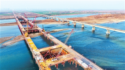 位于洛阳市孟津区的焦济洛平高铁黄河公铁特大桥建设现场,吊塔林立,机械轰鸣。 郑占波 李玑 摄