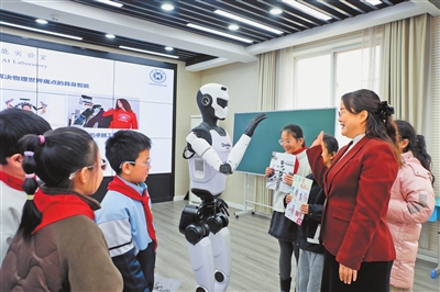 近日,河南省科学院“行者二号”机器人走进焦作市山阳区塔南路小学,与小朋友互动,灵活完成挥手、行走等动作,把科技知识变成可触摸、可感受的生动课堂。 宋崇飞 摄