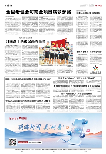 本报讯(全媒体记者 黄晖)记者从省体育局获悉,为期7天的2026年亚洲场地自行车锦标赛3月31日在菲律宾大雅台市(Tagaytay City)落幕。代表国家队出战的河南巴迪瑞自行车队两名选手裴正宇、杨阳携手国家队队友夺得男子团体追逐赛冠军并打破全国纪录,裴正宇更是在男子4公里个人追逐赛中打破亚洲纪录,勇夺金牌,助力中国场地自行车队在洛杉矶奥运周期写下精彩开篇。
