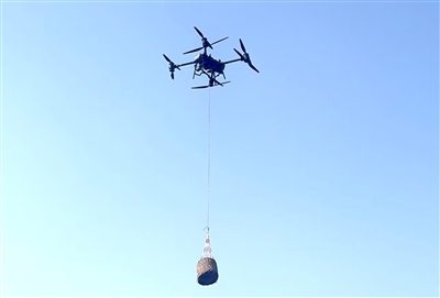 4月1日,郑州市林业局森林防火应急大队无人机中队在实战演练中,通过无人机运送森林防火物资。王璐瑶 摄