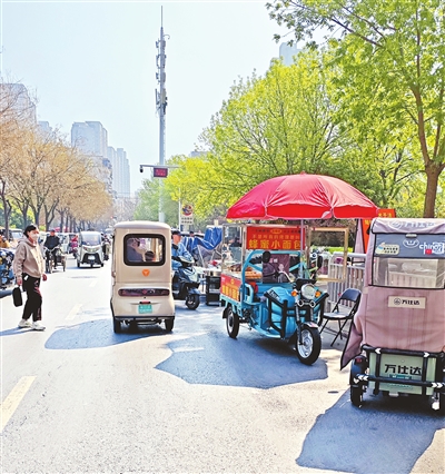 4月1日下午,郑州市金水区纬五路与经一路交叉口附近占道经营情况。单天瑞 摄