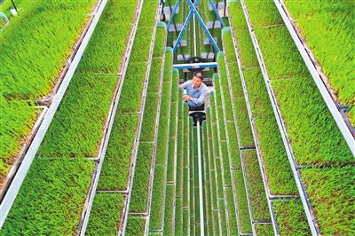 4月6日,在信阳市光山县青龙河合作社全自动智能化育秧工厂,工作人员在管护水稻秧苗。 谢万柏 摄