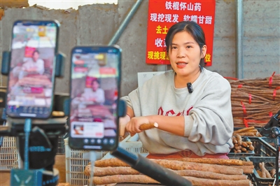 在武陟县大封镇的一家怀药种植专业合作社,社员在直播销售怀山药。 王琳锋 摄