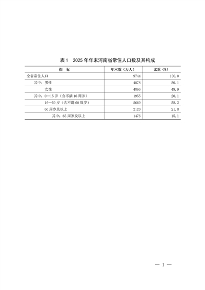 年末全省常住人口9744万人,其中城镇常住人口5842万人,乡村常住人口3902万人;常住人口城镇化率为59.95%。全年出生人口61.1万人,出生率为6.26‰;死亡人口81.9万人,死亡率为8.39‰;自然增长率为-2.13‰。