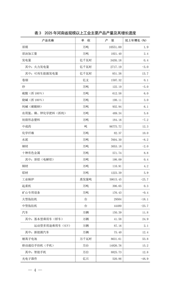 表3 2025年河南省规模以上工业主要产品产量及其增长速度