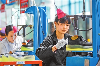 4月16日,在商丘市睢县高新技术产业开发区制鞋产业园区内,各制鞋企业正在抓紧生产,赶制订单。 徐泽源 摄