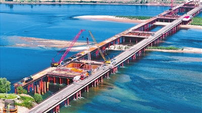 4月18日,洛阳市孟津区焦济洛平高铁洛阳黄河公铁大桥建设现场塔吊林立、机械轰鸣,施工正有序推进。大桥全长13.36公里,为双层结构:上层为208国道,双向八车道公路,设计时速80公里;下层为双线高速铁路,设计时速350公里,是呼南高铁的关键控制性工程。大桥建成后将完善洛阳及沿线城市区域综合交通网络,强化互联互通,助力豫西经济与文旅融合高质量发展。 王宏欣 摄
