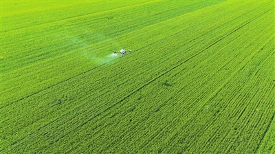 4月18日,社旗县晋庄镇,搭载北斗导航系统的植保无人机正为生机盎然的小麦进行“一喷三防”作业,为抽穗扬花期的小麦筑牢病虫害防线。 王小军 摄