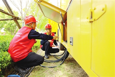 保电人员在UPS电源车旁开展负荷测试,保障大典供电稳定可靠。