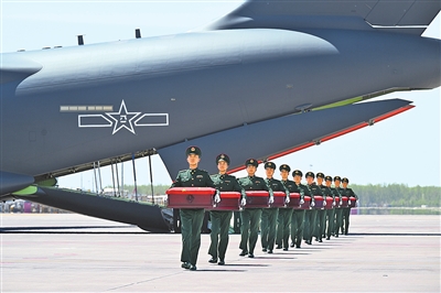 22日上午,中韩双方在韩国仁川国际机场举行志愿军烈士遗骸交接仪式。9时50分许,呼号为“荣归50”的运-20B起飞。进入中国领空后,呼号为“红鹰”的4架歼-20迎接护航,“双20”列阵长空致以崇高敬意。11时25分,运-20B平稳降落在辽宁沈阳桃仙国际机场,机场以“过水门”最高礼遇为英灵洗尘。